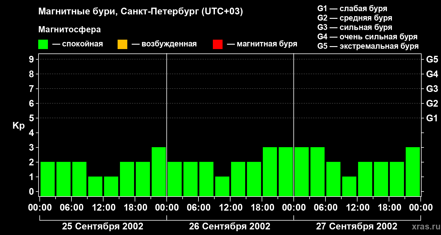 Изменения геомагнитного индекса Kp с 25 по 27 сентября 2002 года для средних широт