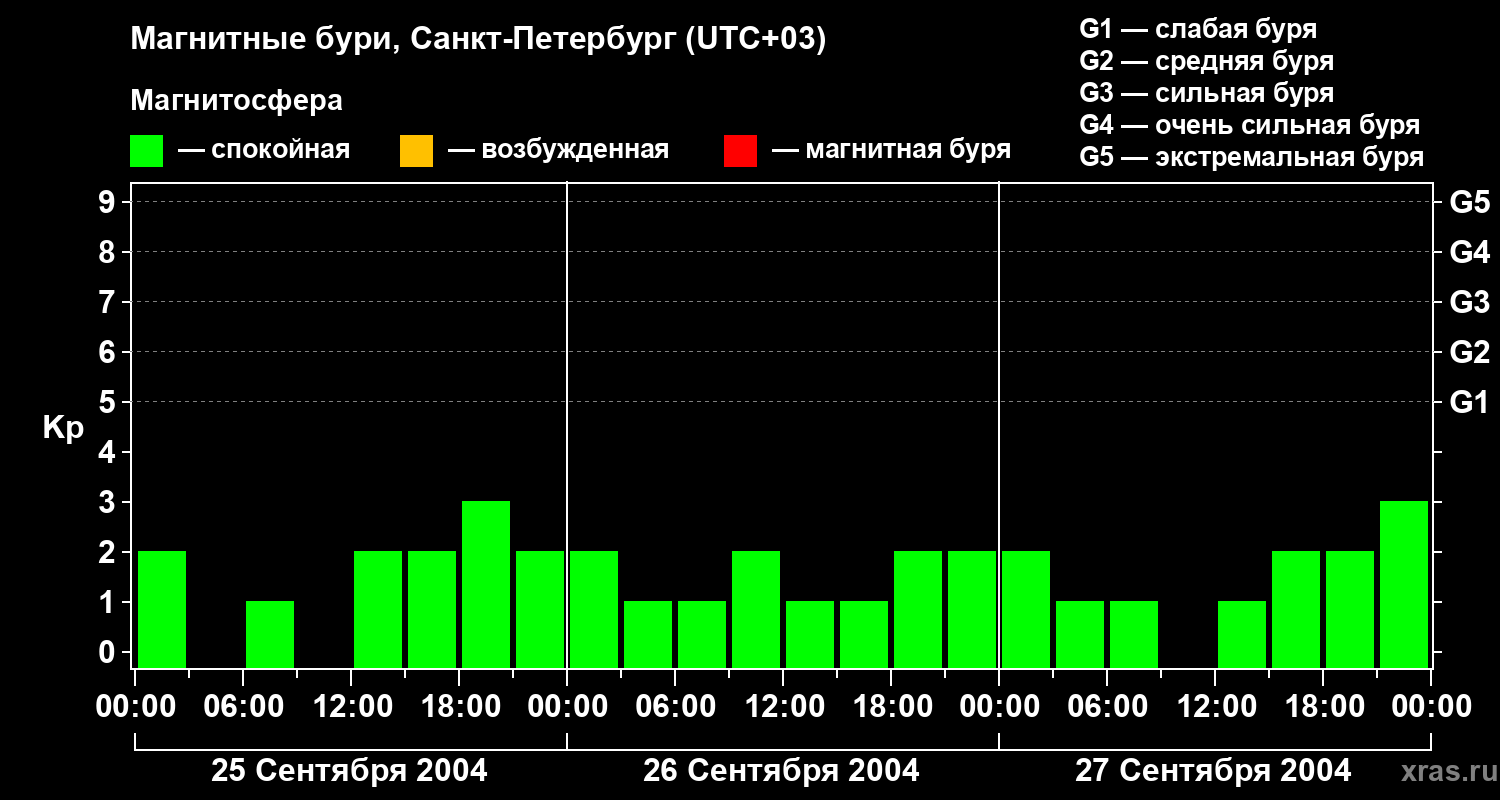 Изменения геомагнитного индекса Kp с 25 по 27 сентября 2004 года для средних широт