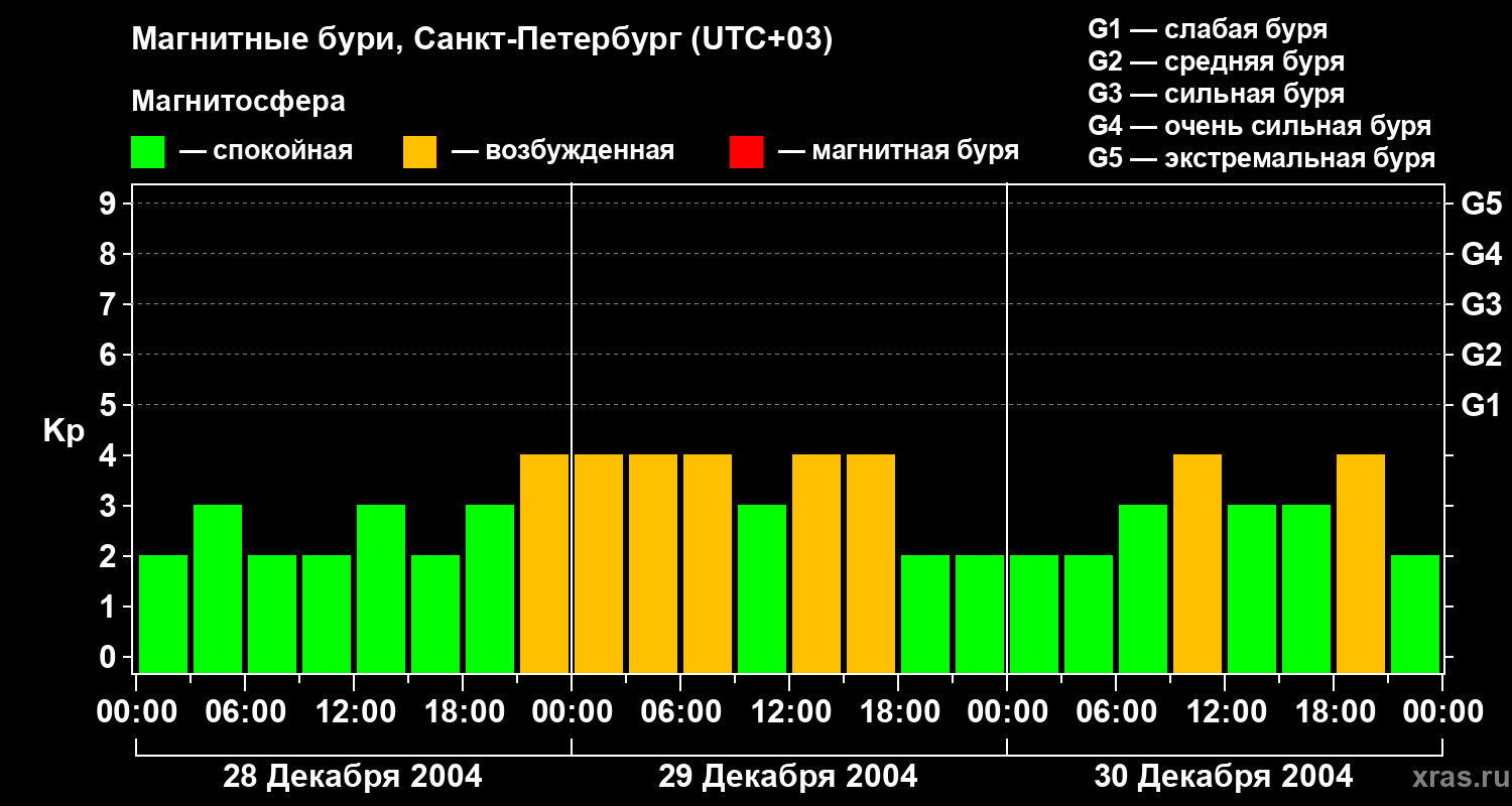 Изменения геомагнитного индекса Kp с 28 по 30 декабря 2004 года для средних широт