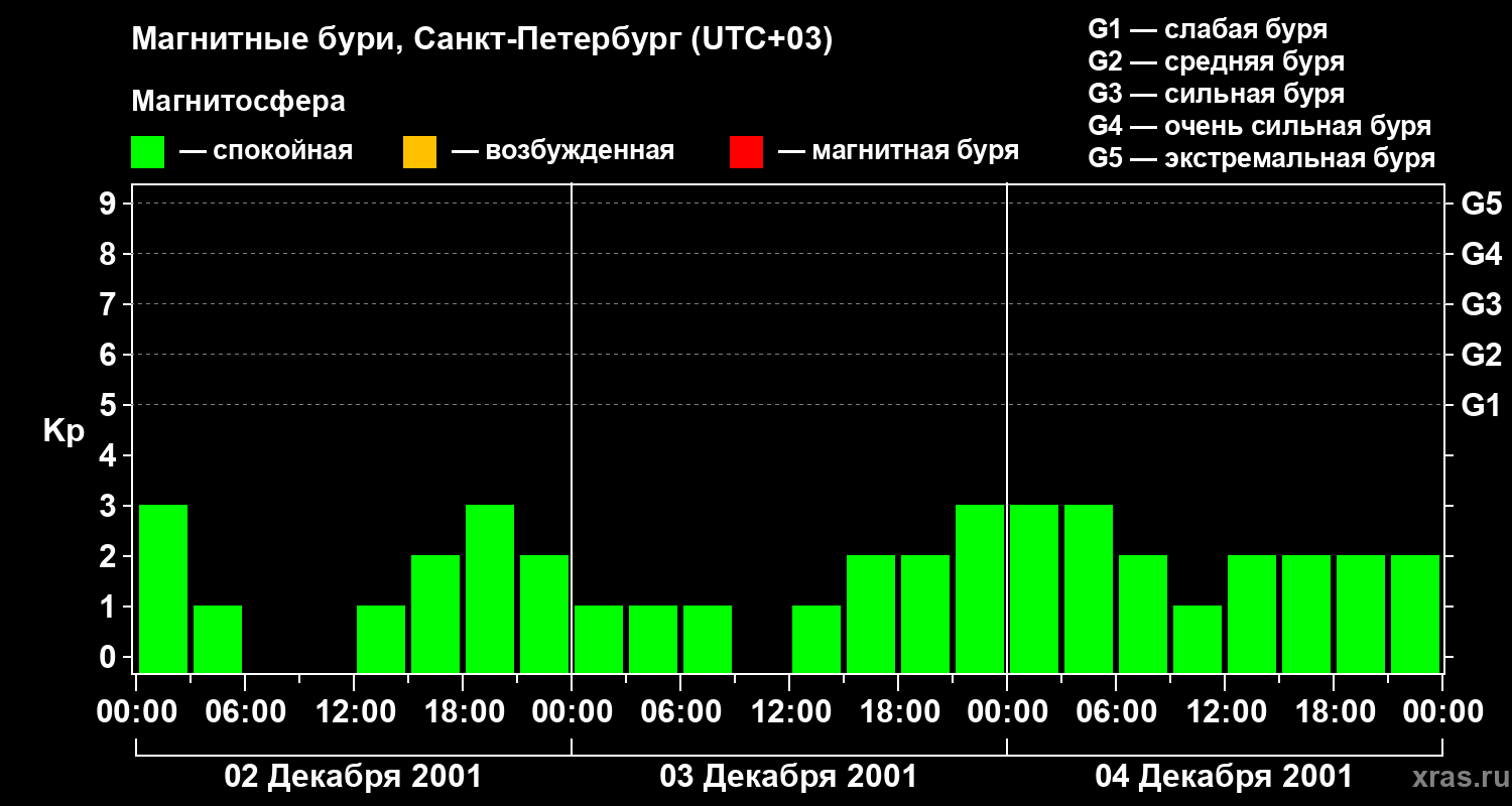 Изменения геомагнитного индекса Kp с 2 по 4 декабря 2001 года для средних широт