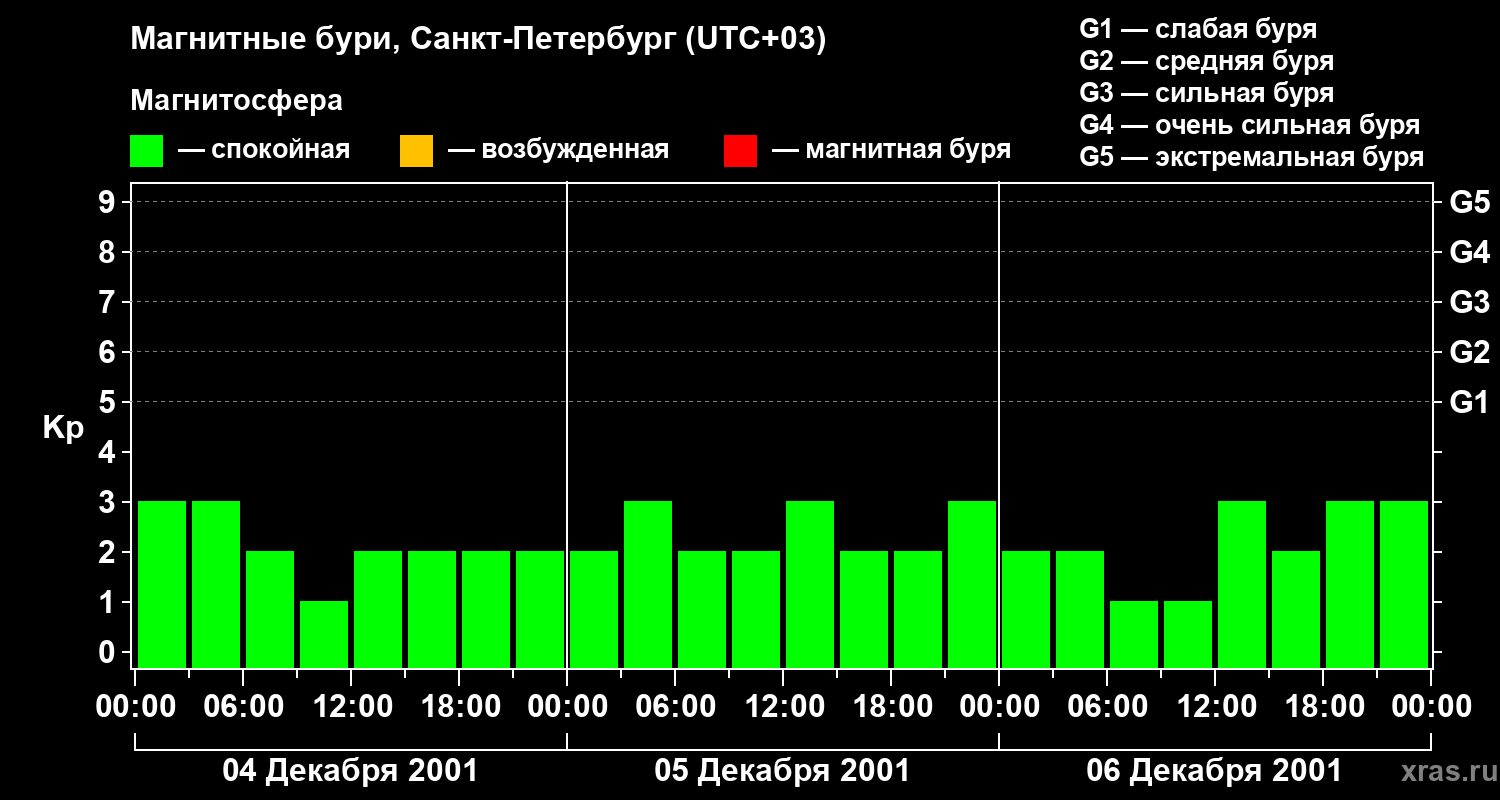Изменения геомагнитного индекса Kp с 4 по 6 декабря 2001 года для средних широт