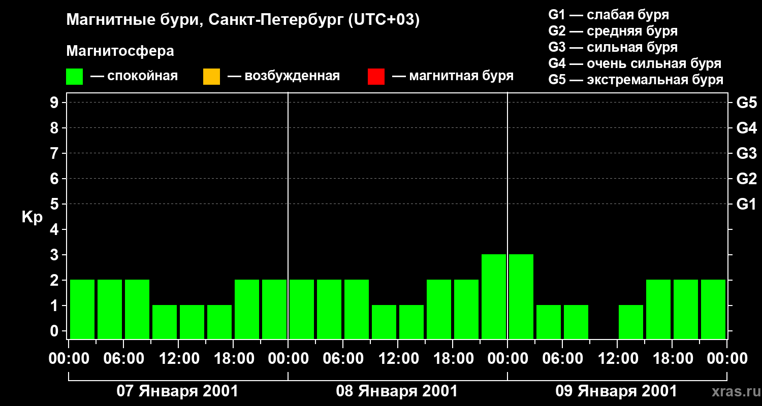 Изменения геомагнитного индекса Kp с 7 по 9 января 2001 года для средних широт
