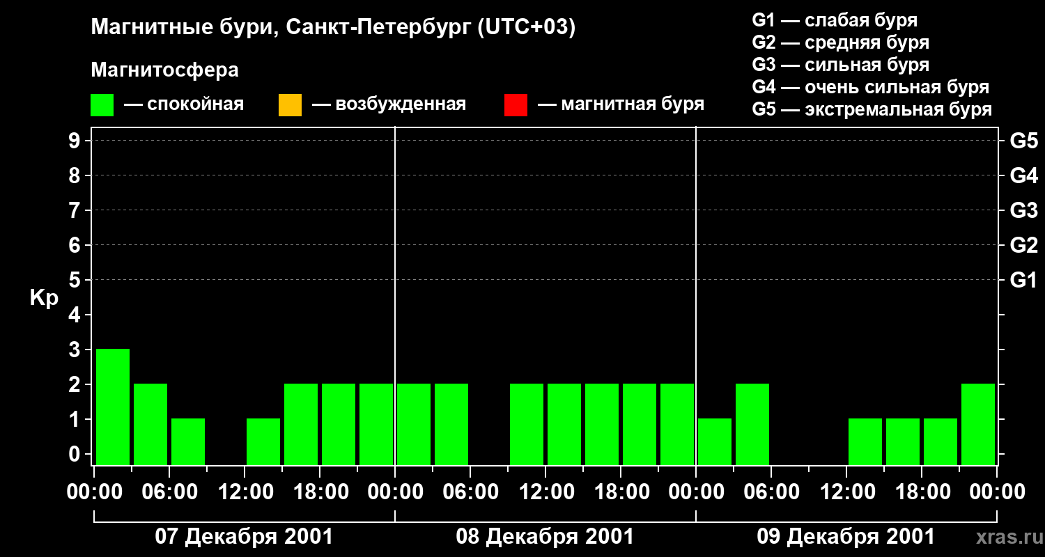 Изменения геомагнитного индекса Kp с 7 по 9 декабря 2001 года для средних широт
