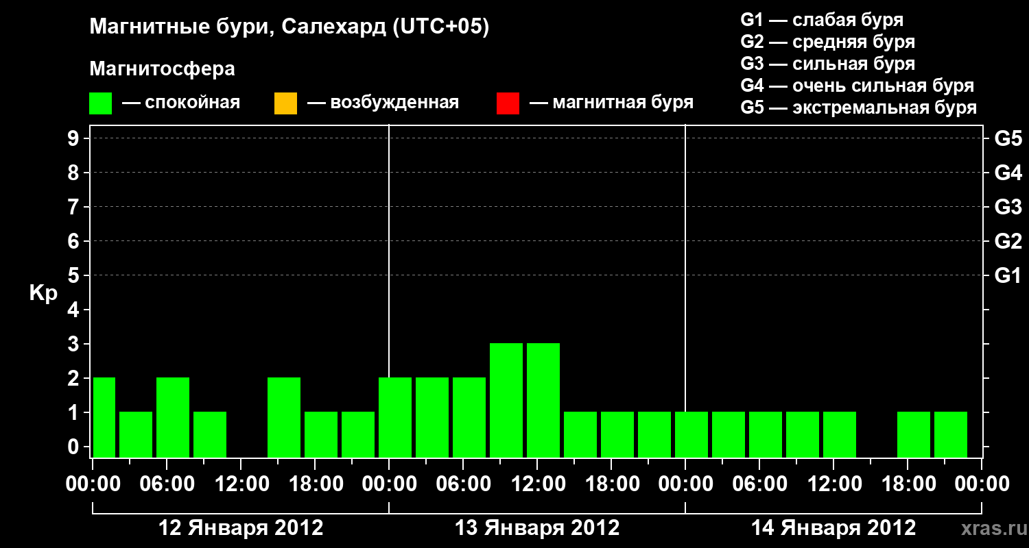 Изменения геомагнитного индекса Kp с 12 по 14 января 2012 года для средних широт
