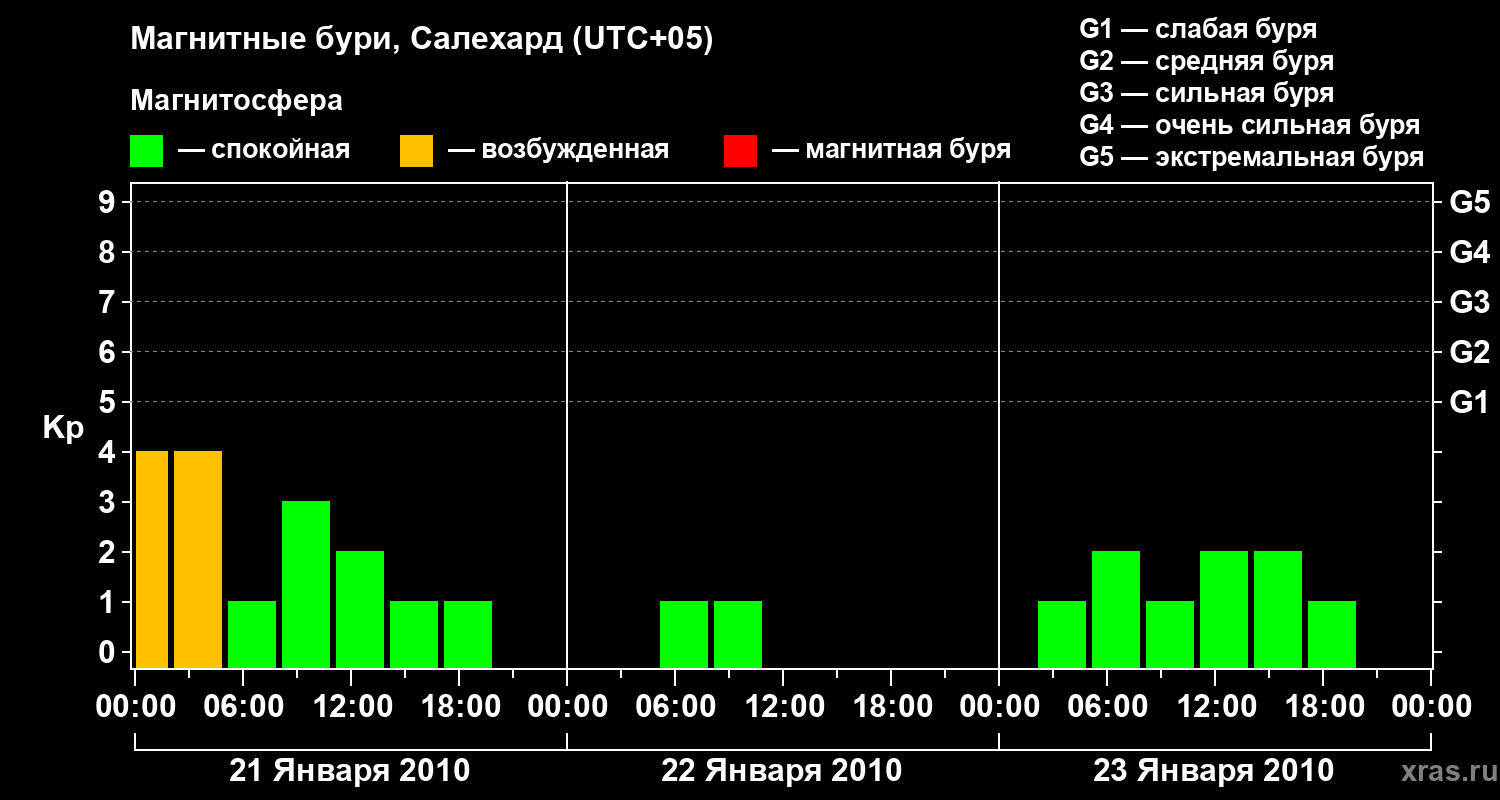 Изменения геомагнитного индекса Kp с 21 по 23 января 2010 года для средних широт