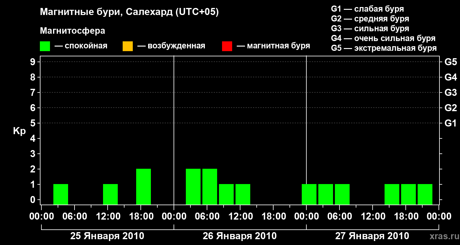 Изменения геомагнитного индекса Kp с 25 по 27 января 2010 года для средних широт