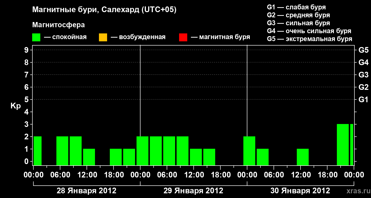 Изменения геомагнитного индекса Kp с 28 по 30 января 2012 года для средних широт