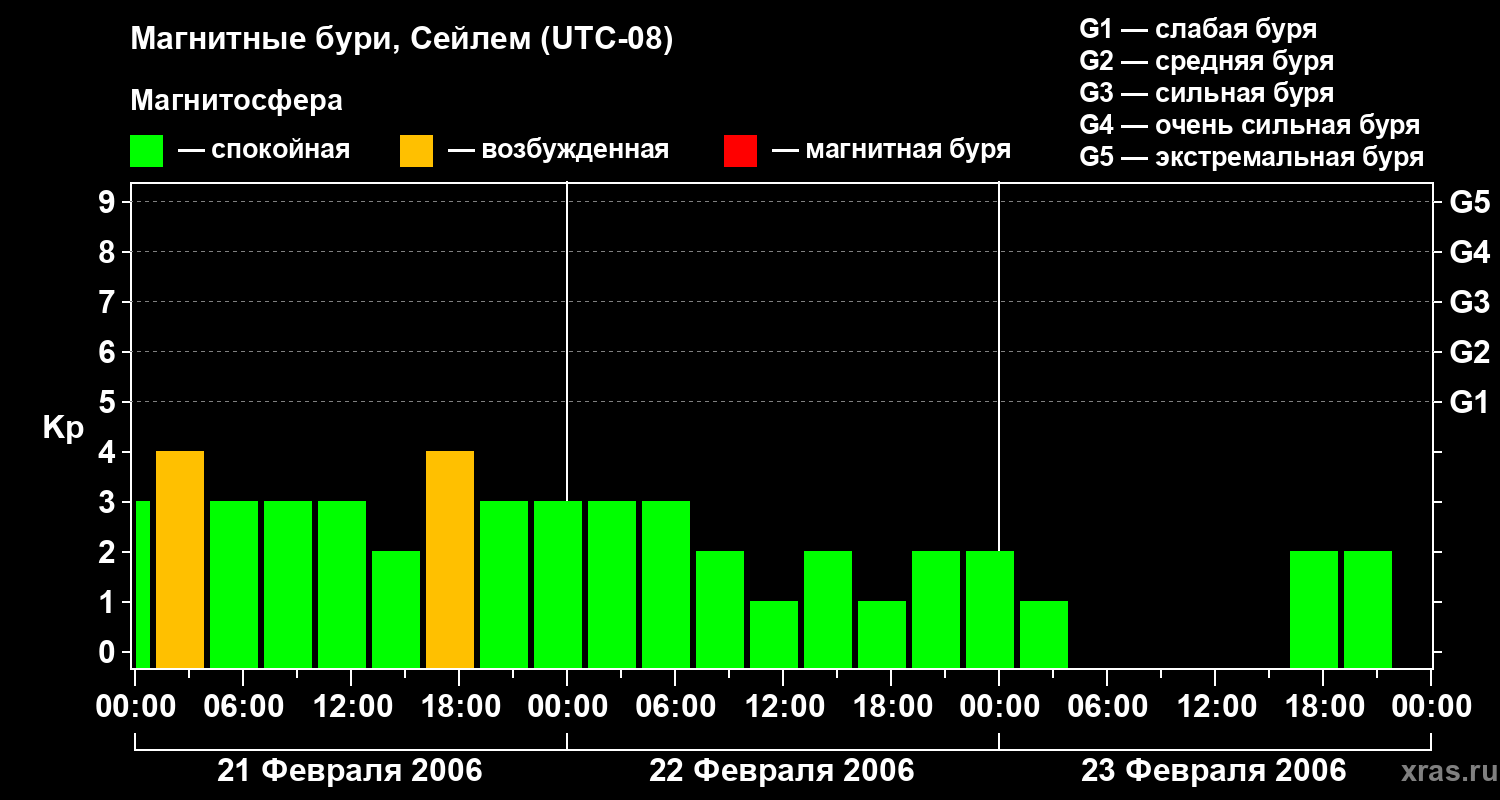 Изменения геомагнитного индекса Kp с 21 по 23 февраля 2006 года для средних широт
