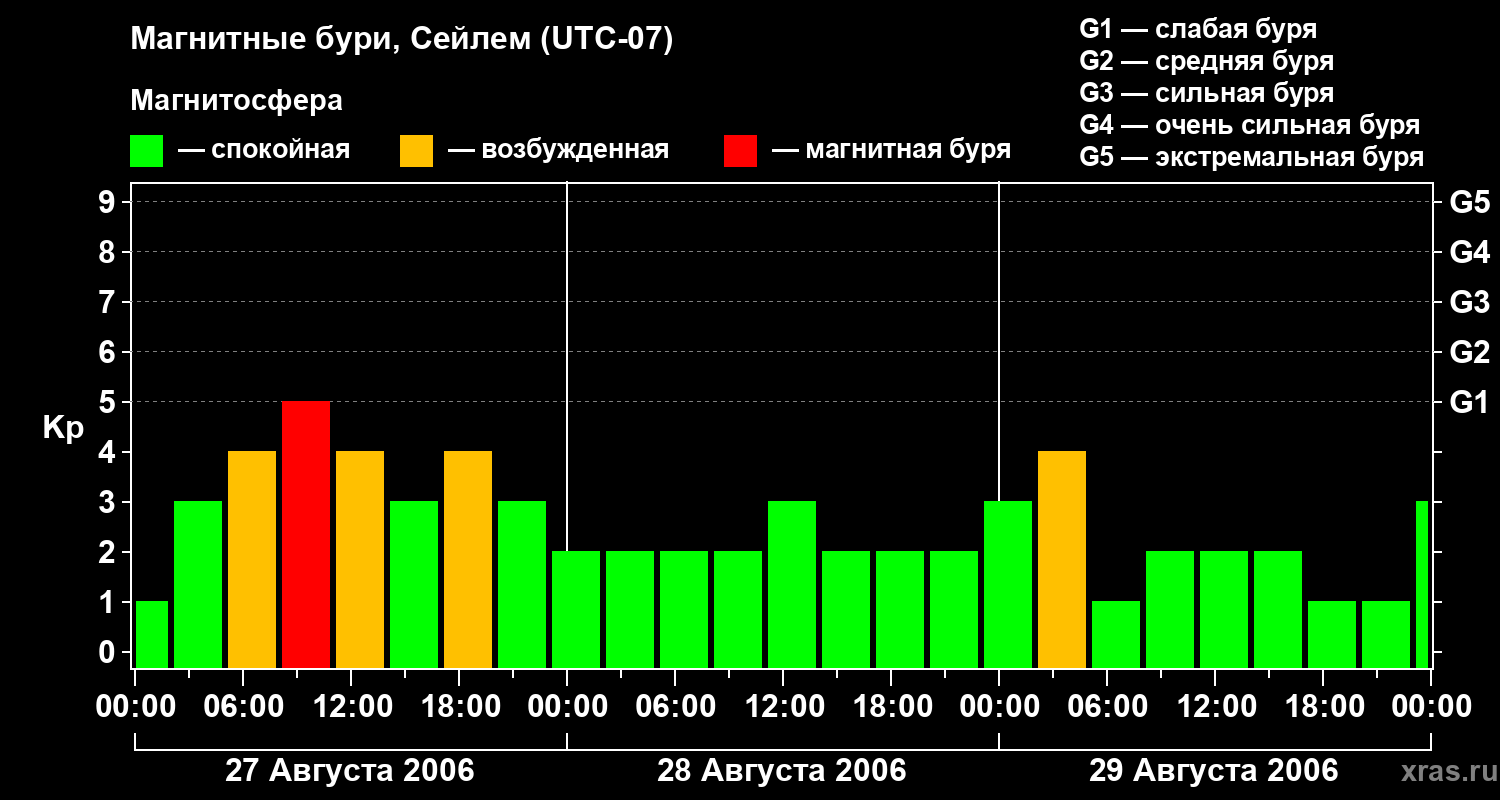 Изменения геомагнитного индекса Kp с 27 по 29 августа 2006 года для средних широт