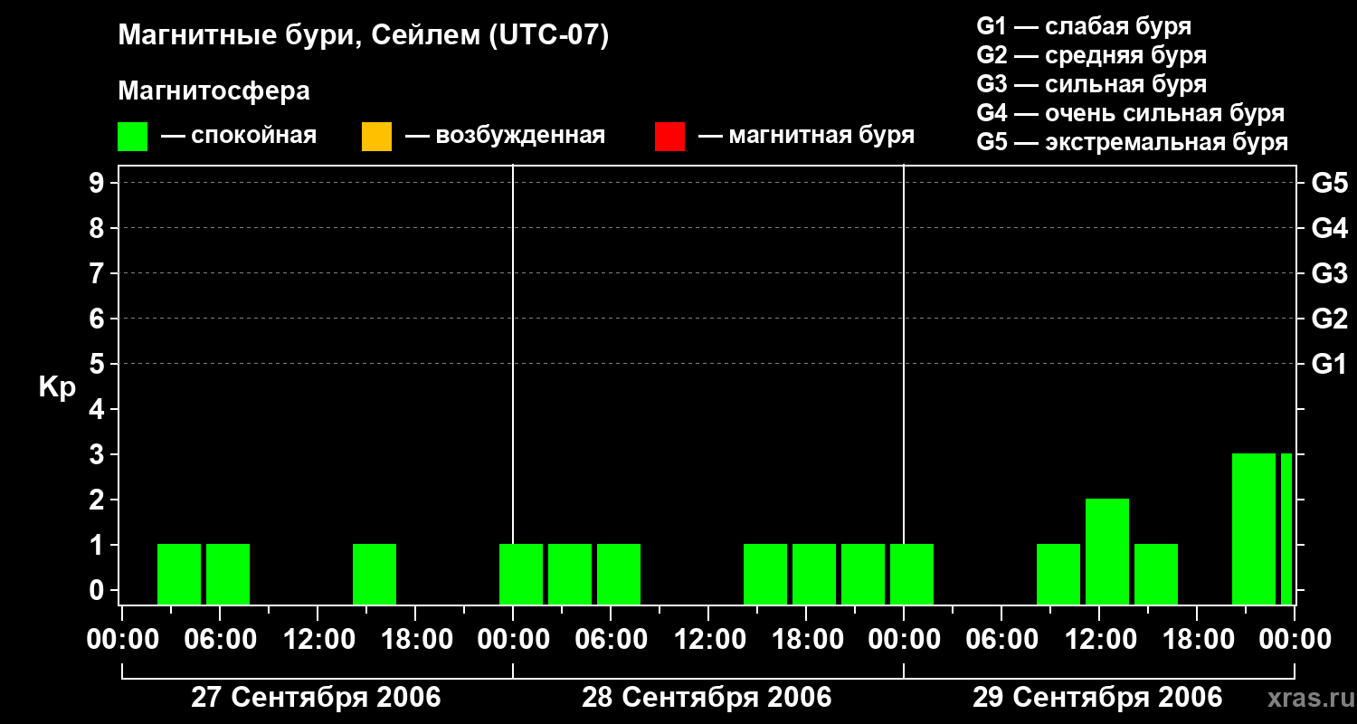 Изменения геомагнитного индекса Kp с 27 по 29 сентября 2006 года для средних широт