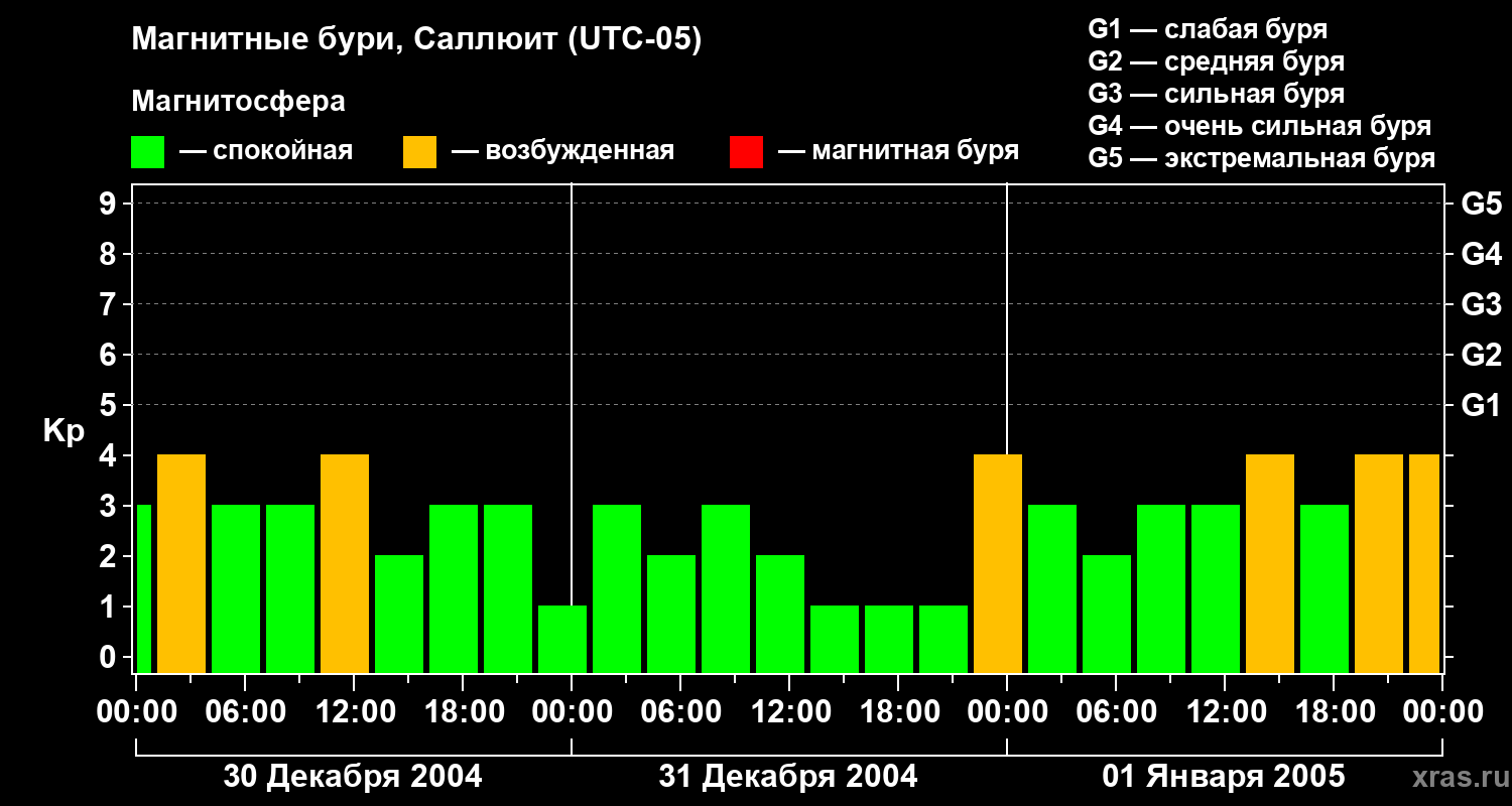 Изменения геомагнитного индекса Kp с 30 декабря 2004 года по 1 января 2005 года для средних широт