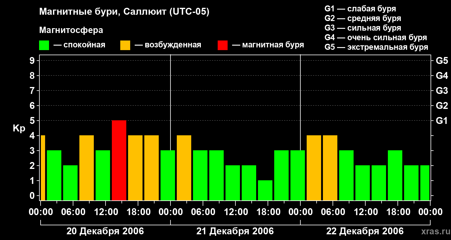 Изменения геомагнитного индекса Kp с 20 по 22 декабря 2006 года для средних широт