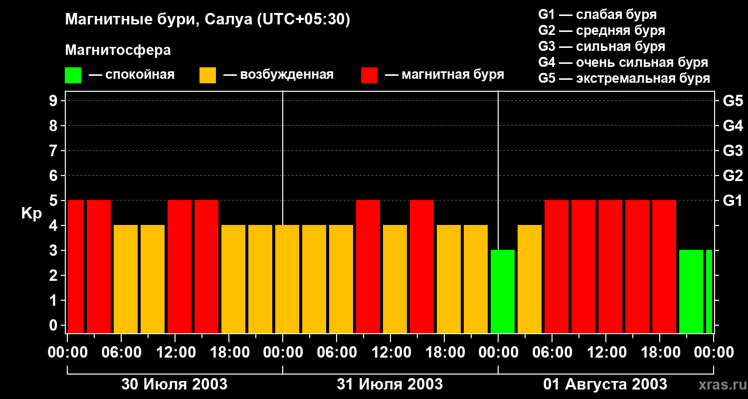 Изменения геомагнитного индекса Kp с 30 июля по 1 августа 2003 года для средних широт