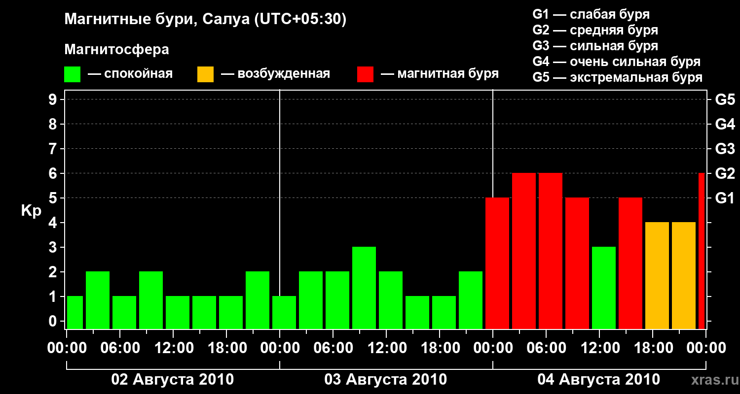 Изменения геомагнитного индекса Kp с 2 по 4 августа 2010 года для средних широт