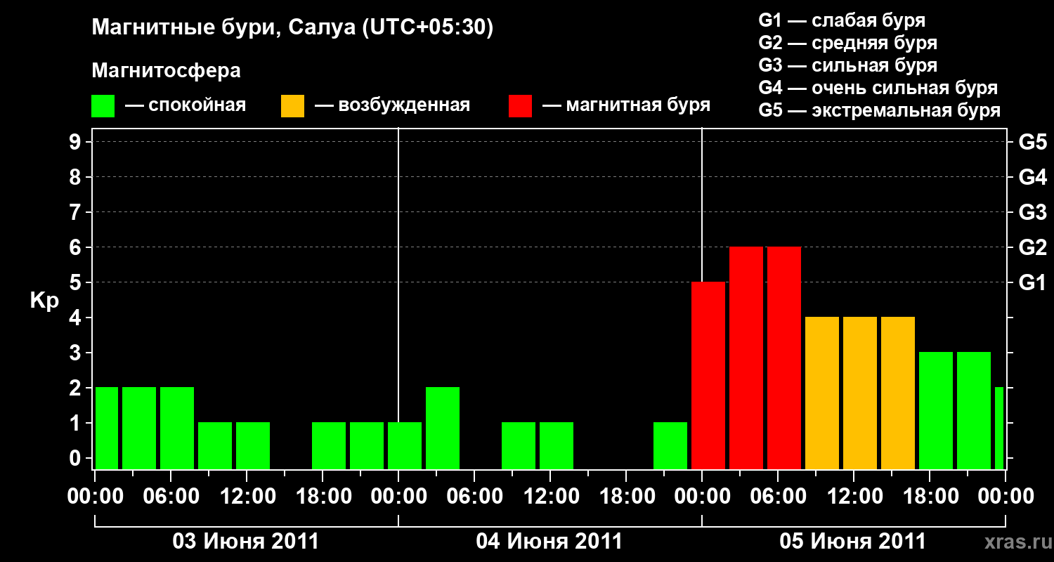 Изменения геомагнитного индекса Kp с 3 по 5 июня 2011 года для средних широт
