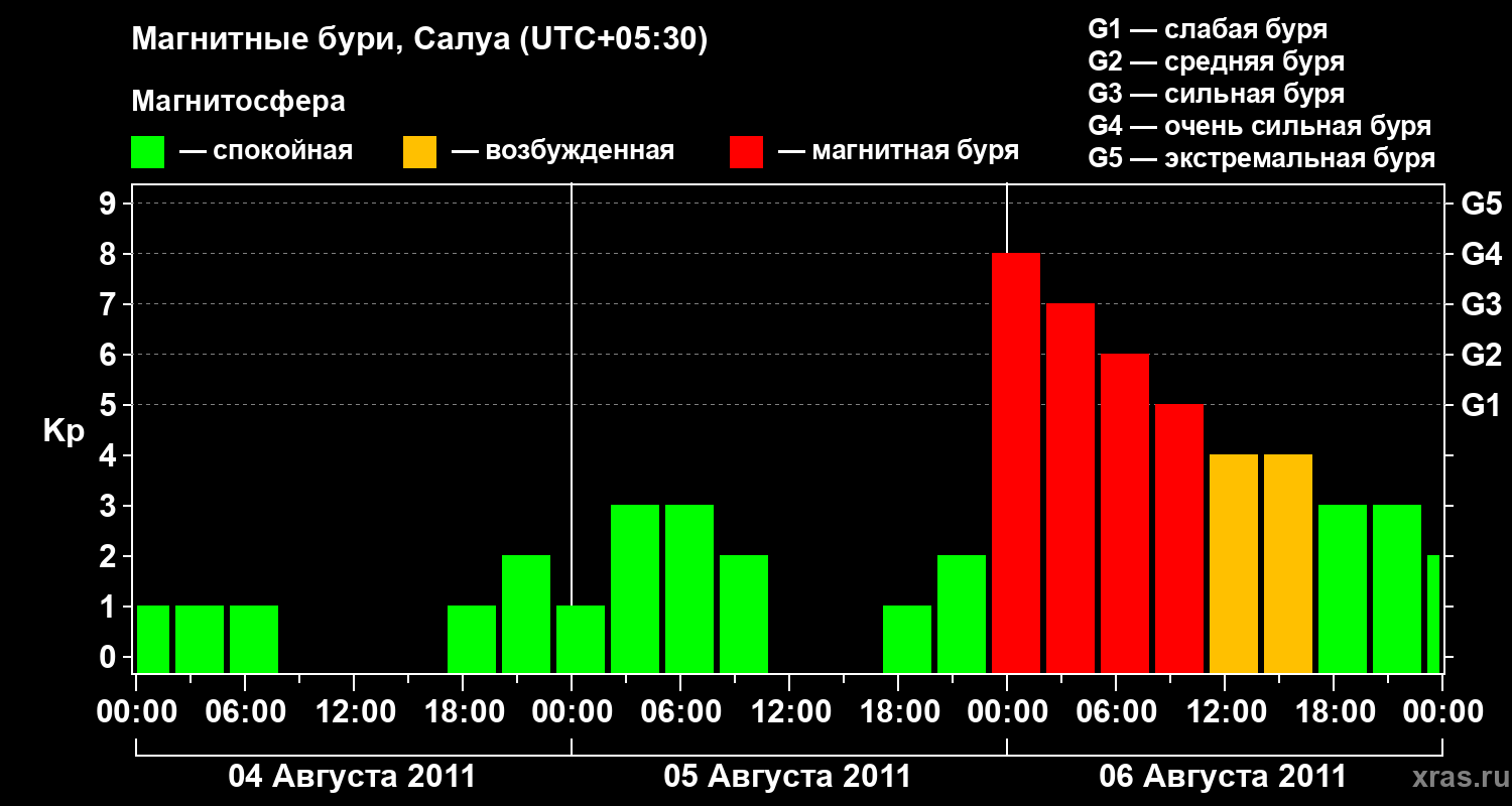 Изменения геомагнитного индекса Kp с 4 по 6 августа 2011 года для средних широт