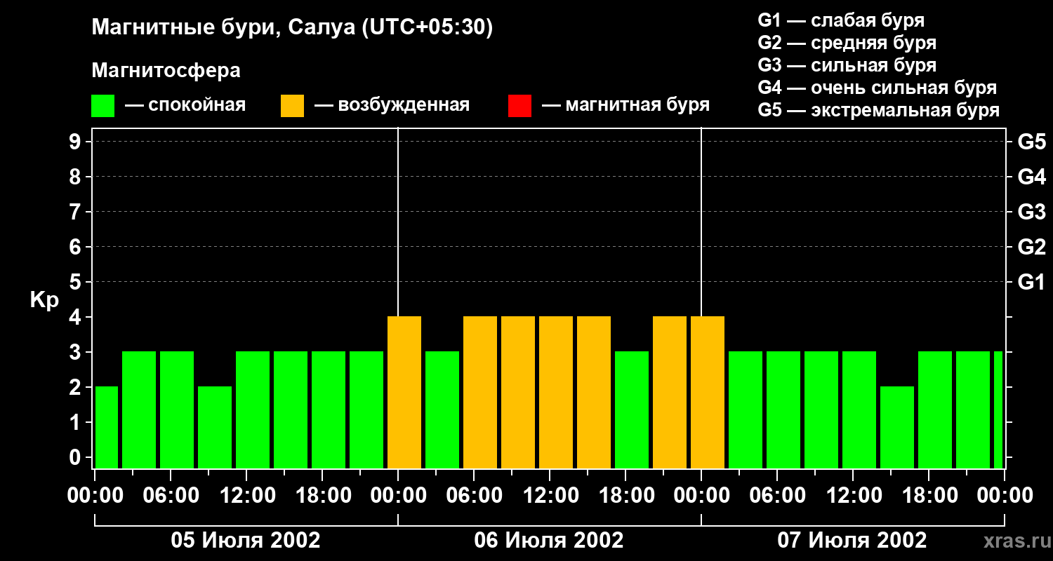 Изменения геомагнитного индекса Kp с 5 по 7 июля 2002 года для средних широт