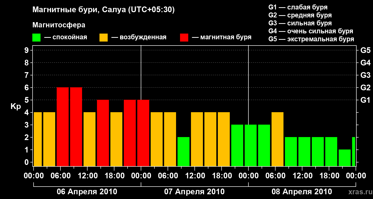 Изменения геомагнитного индекса Kp с 6 по 8 апреля 2010 года для средних широт
