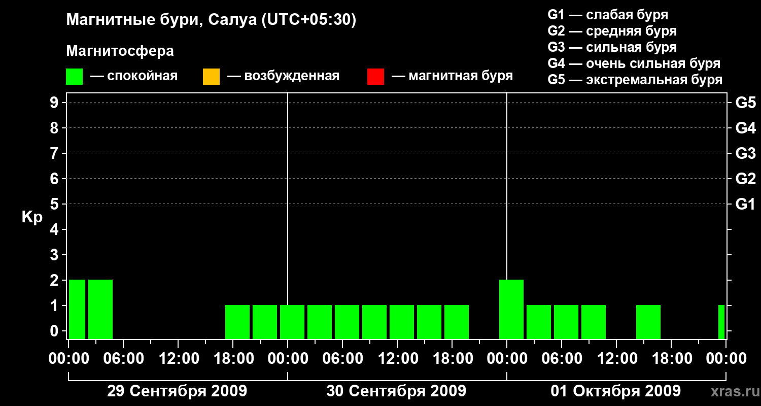 Изменения геомагнитного индекса Kp с 29 сентября по 1 октября 2009 года для средних широт
