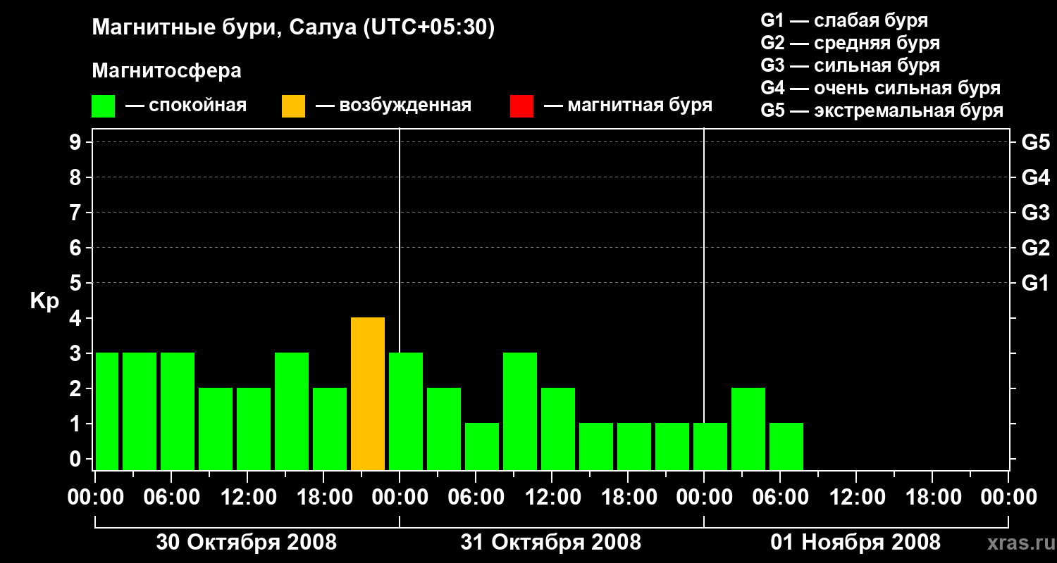 Изменения геомагнитного индекса Kp с 30 октября по 1 ноября 2008 года для средних широт