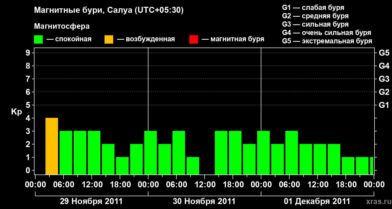 Изменения геомагнитного индекса Kp с 29 ноября по 1 декабря 2011 года для средних широт