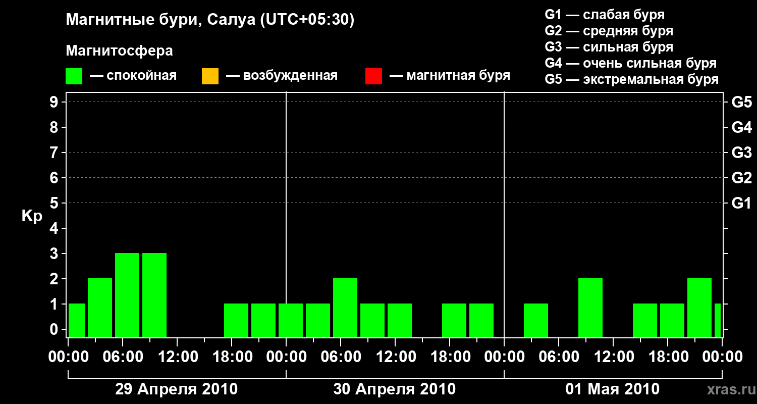 Изменения геомагнитного индекса Kp с 29 апреля по 1 мая 2010 года для средних широт