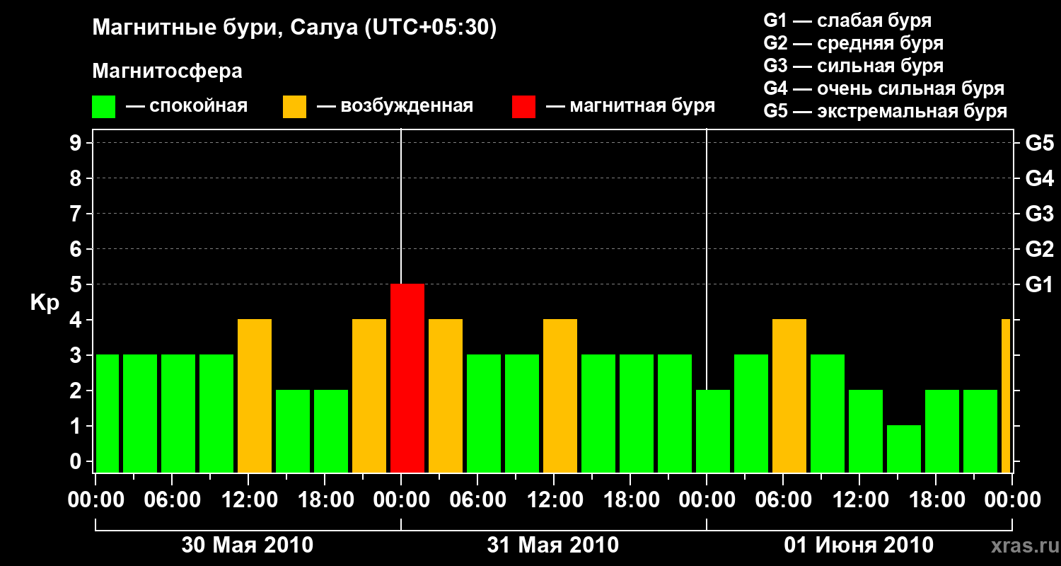 Изменения геомагнитного индекса Kp с 30 мая по 1 июня 2010 года для средних широт