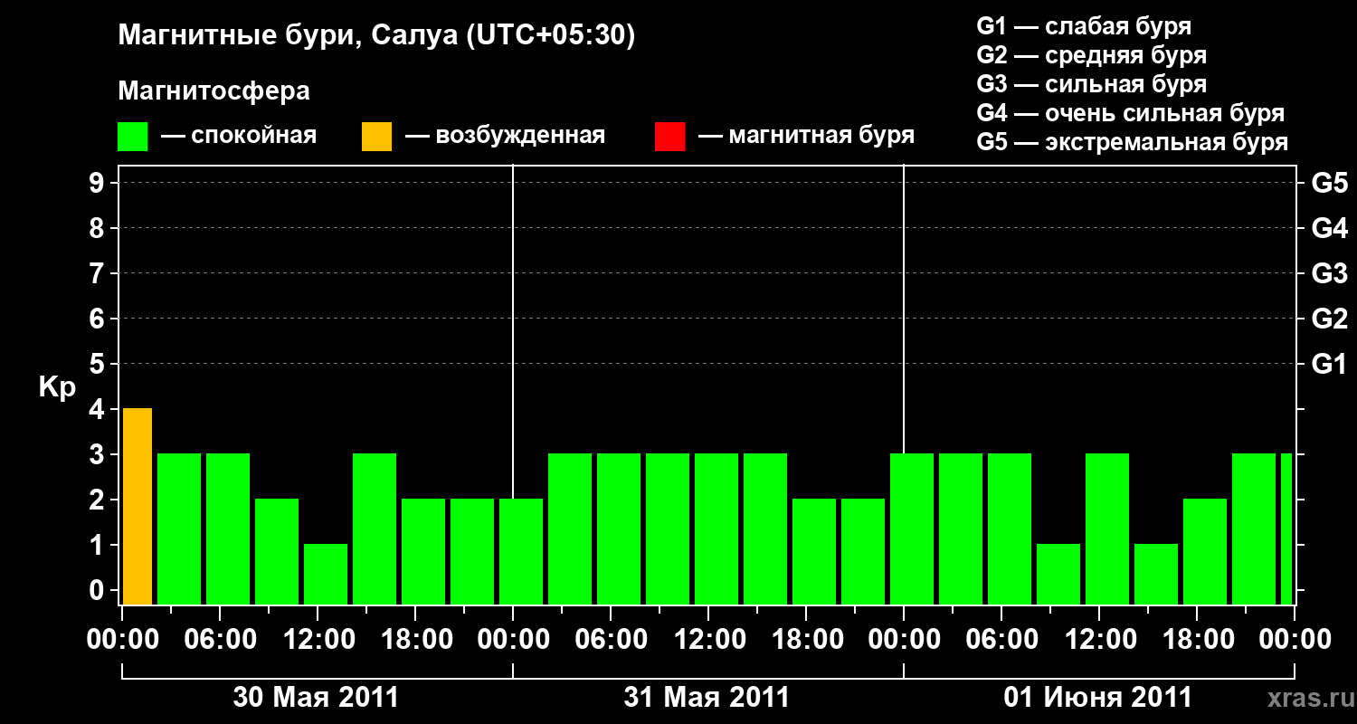 Изменения геомагнитного индекса Kp с 30 мая по 1 июня 2011 года для средних широт