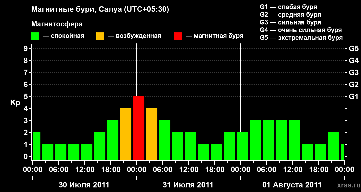 Изменения геомагнитного индекса Kp с 30 июля по 1 августа 2011 года для средних широт