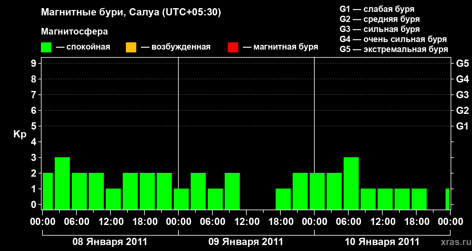 Изменения геомагнитного индекса Kp с 8 по 10 января 2011 года для средних широт