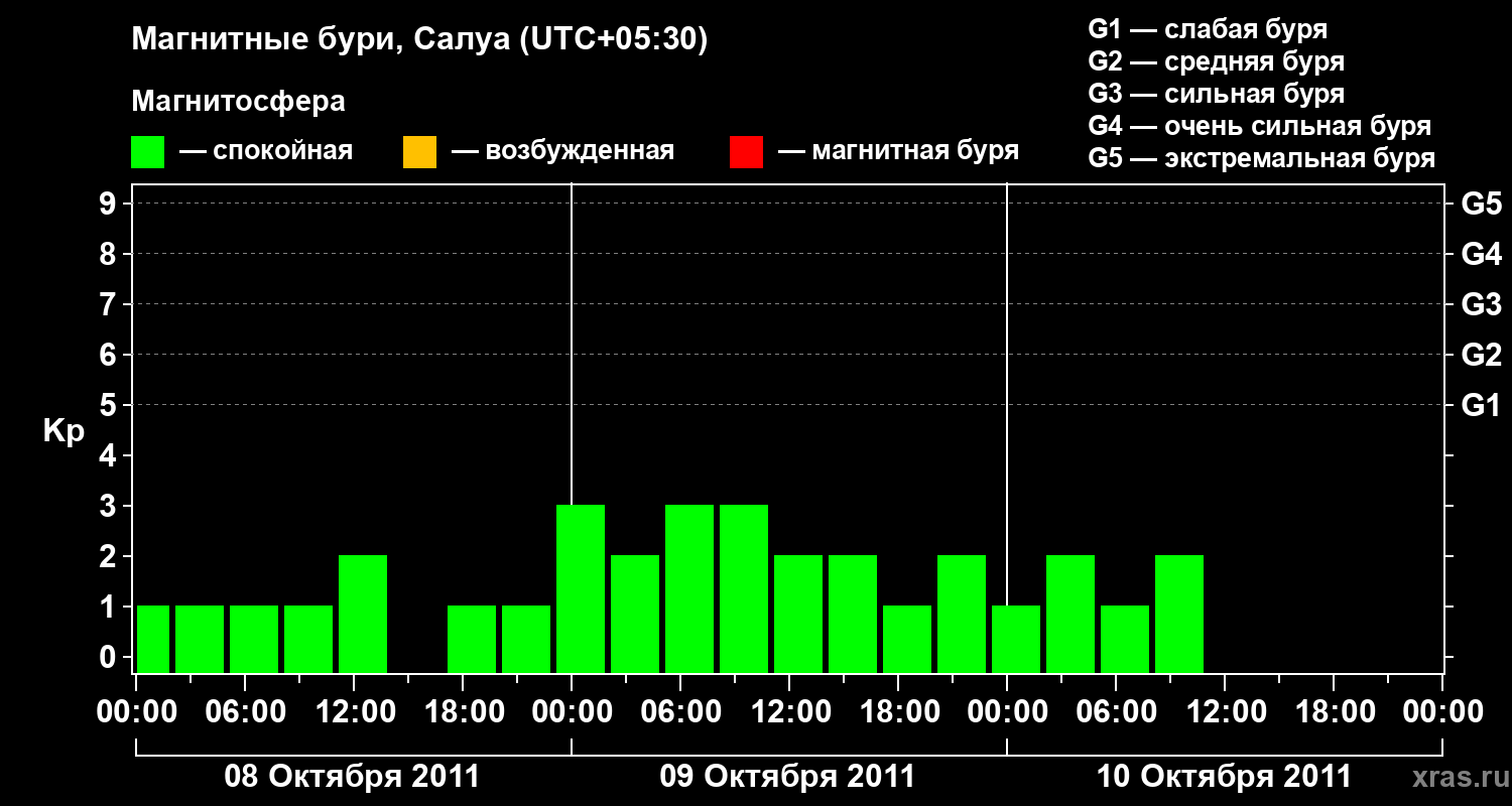 Изменения геомагнитного индекса Kp с 8 по 10 октября 2011 года для средних широт