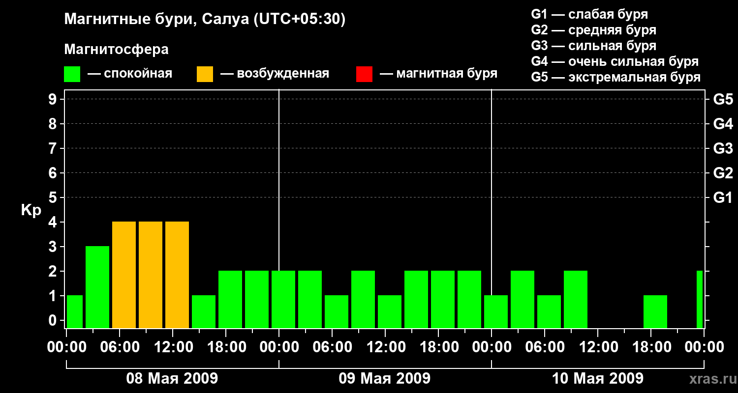 Изменения геомагнитного индекса Kp с 8 по 10 мая 2009 года для средних широт