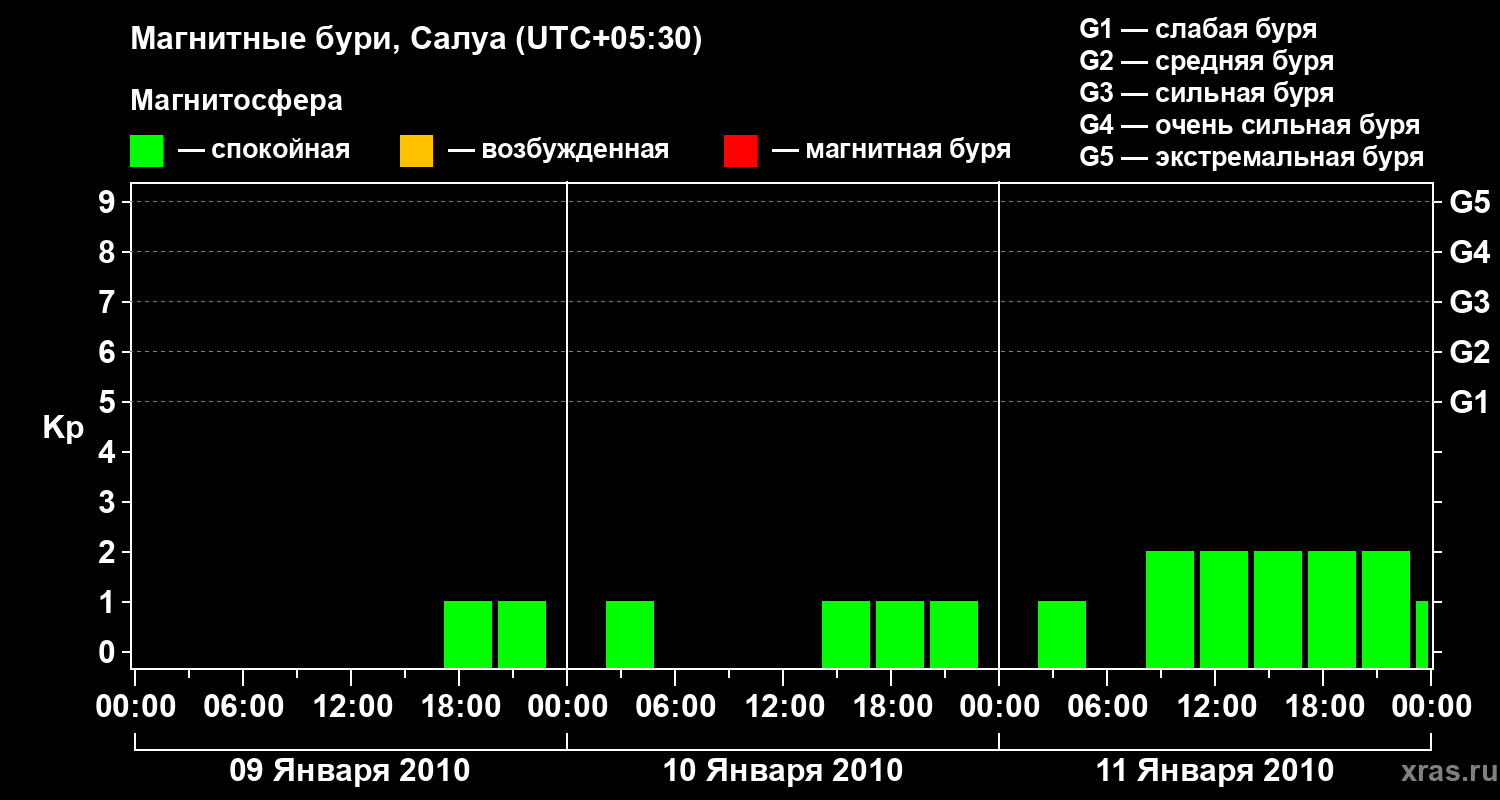 Изменения геомагнитного индекса Kp с 9 по 11 января 2010 года для средних широт