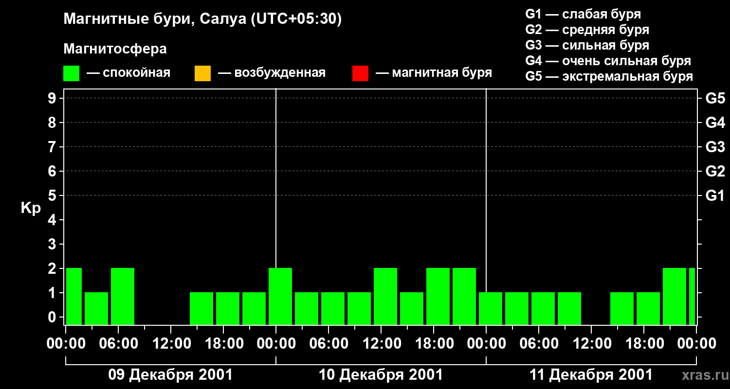 Изменения геомагнитного индекса Kp с 9 по 11 декабря 2001 года для средних широт