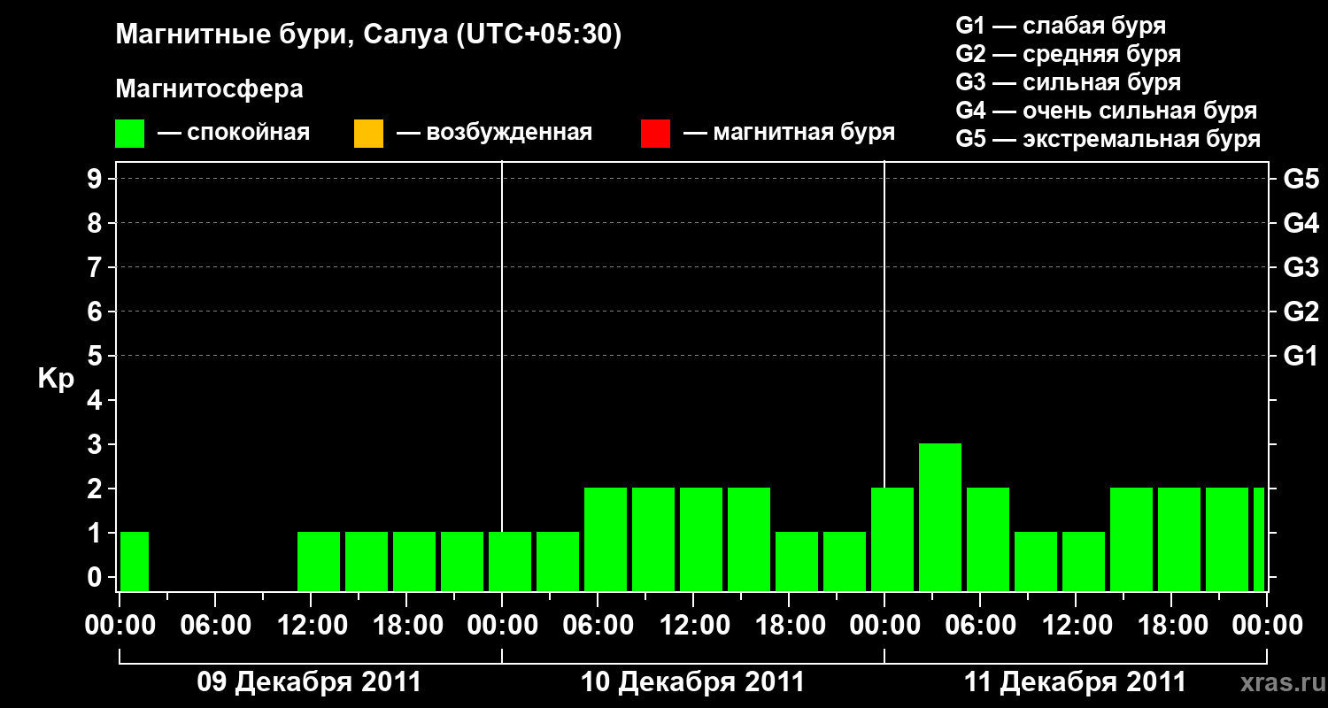 Изменения геомагнитного индекса Kp с 9 по 11 декабря 2011 года для средних широт
