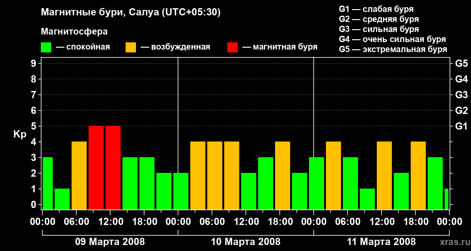 Изменения геомагнитного индекса Kp с 9 по 11 марта 2008 года для средних широт