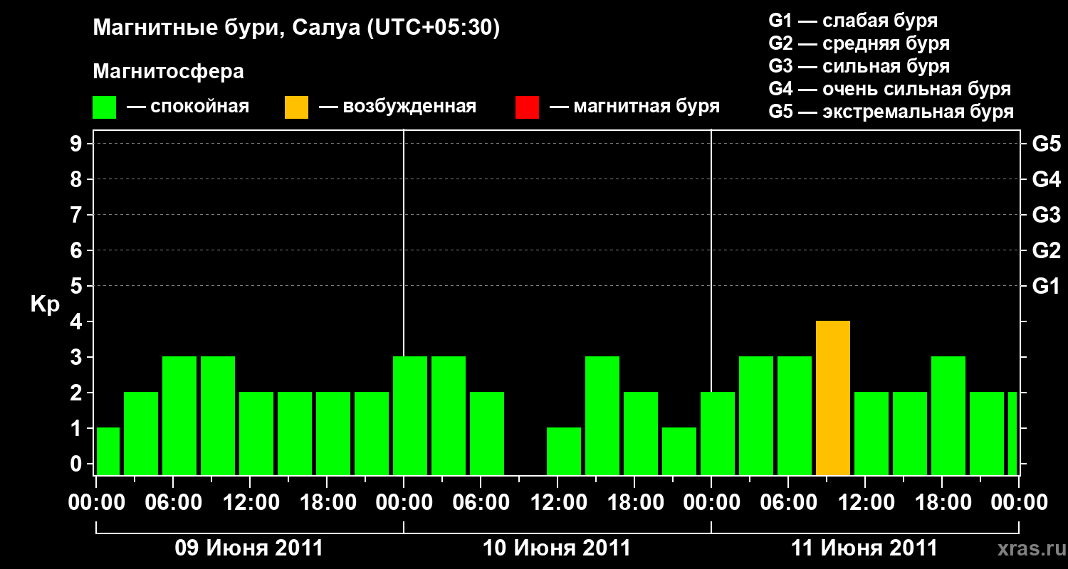 Изменения геомагнитного индекса Kp с 9 по 11 июня 2011 года для средних широт