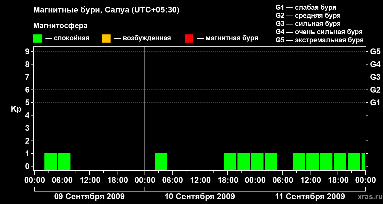 Изменения геомагнитного индекса Kp с 9 по 11 сентября 2009 года для средних широт