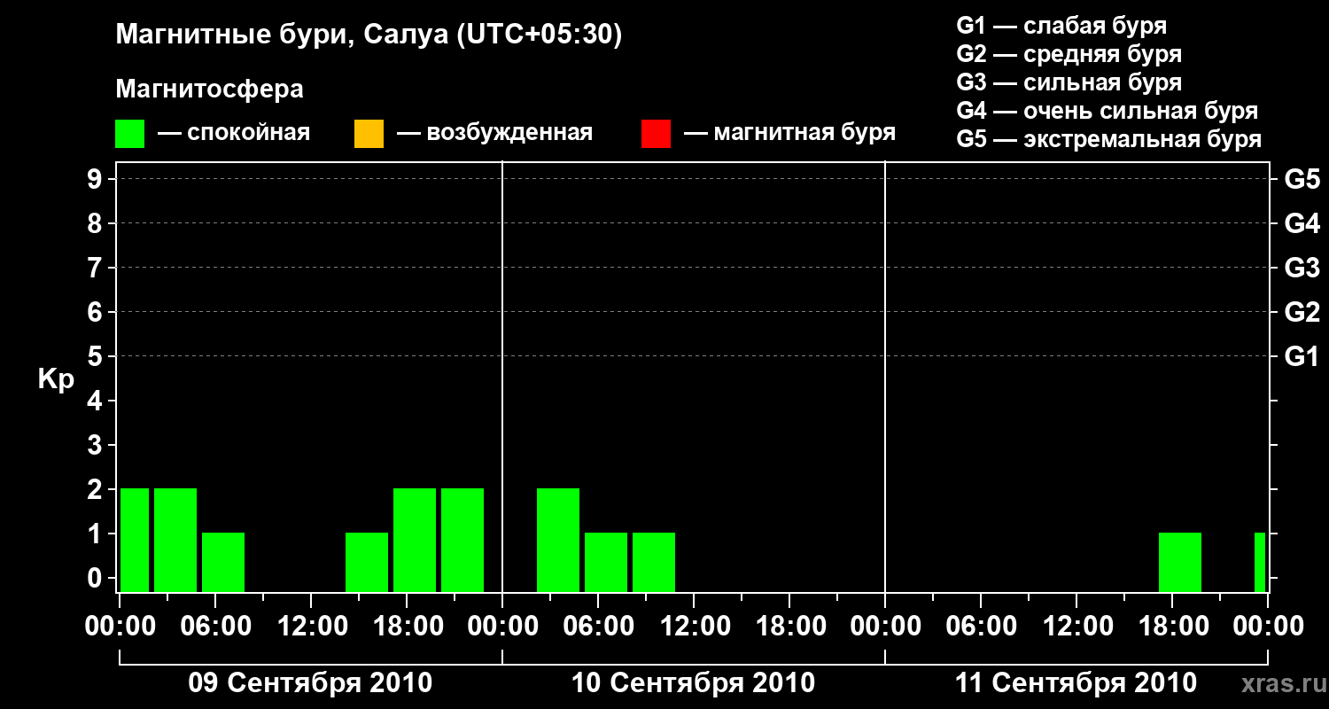 Изменения геомагнитного индекса Kp с 9 по 11 сентября 2010 года для средних широт