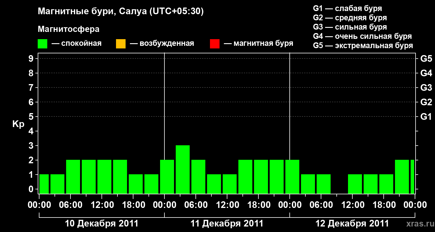 Изменения геомагнитного индекса Kp с 10 по 12 декабря 2011 года для средних широт