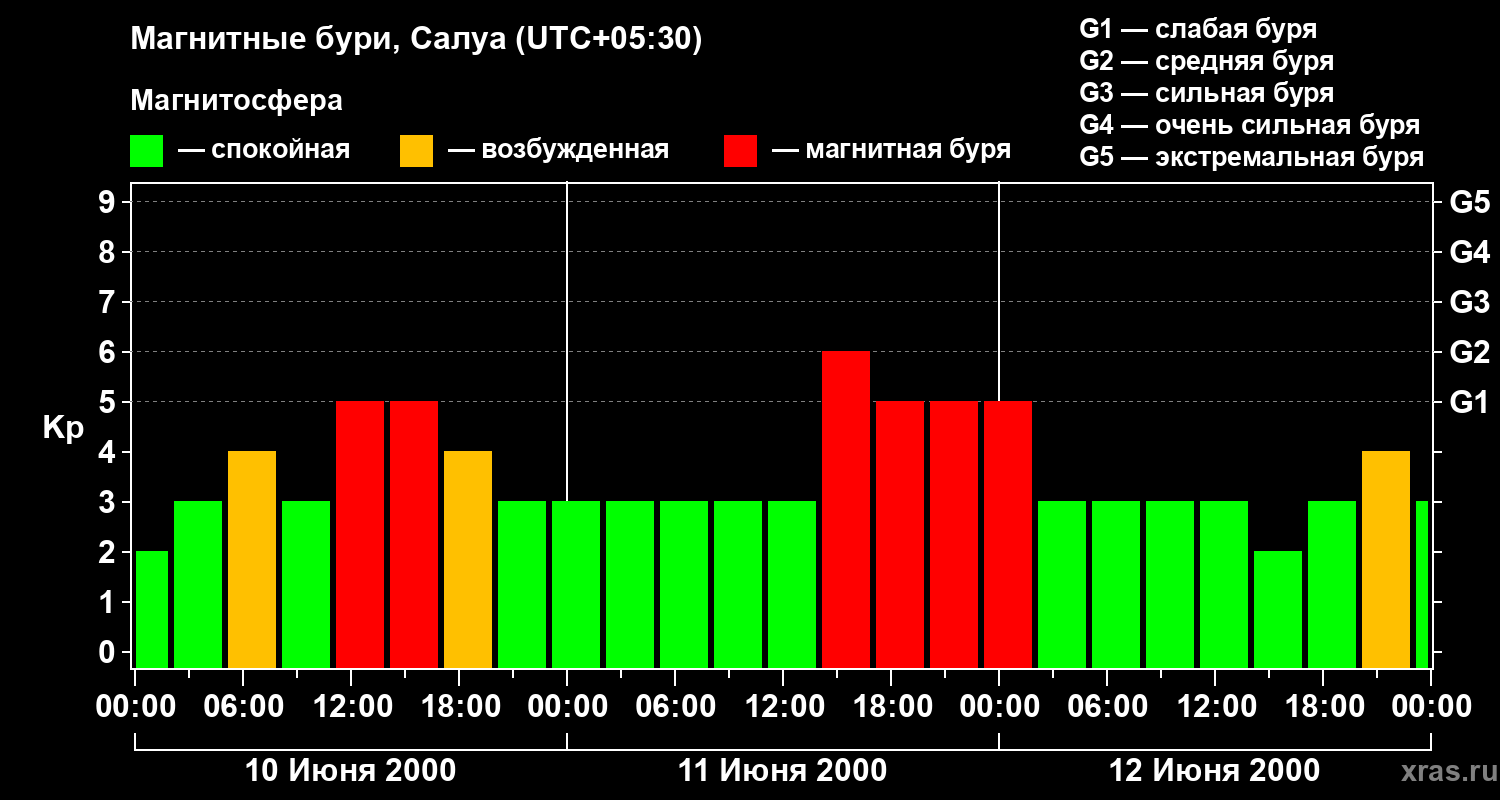 Изменения геомагнитного индекса Kp с 10 по 12 июня 2000 года для средних широт