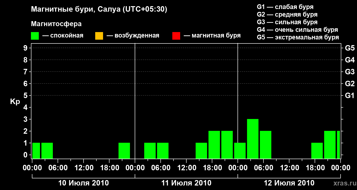 Изменения геомагнитного индекса Kp с 10 по 12 июля 2010 года для средних широт