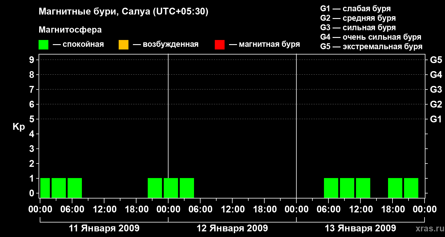 Изменения геомагнитного индекса Kp с 11 по 13 января 2009 года для средних широт