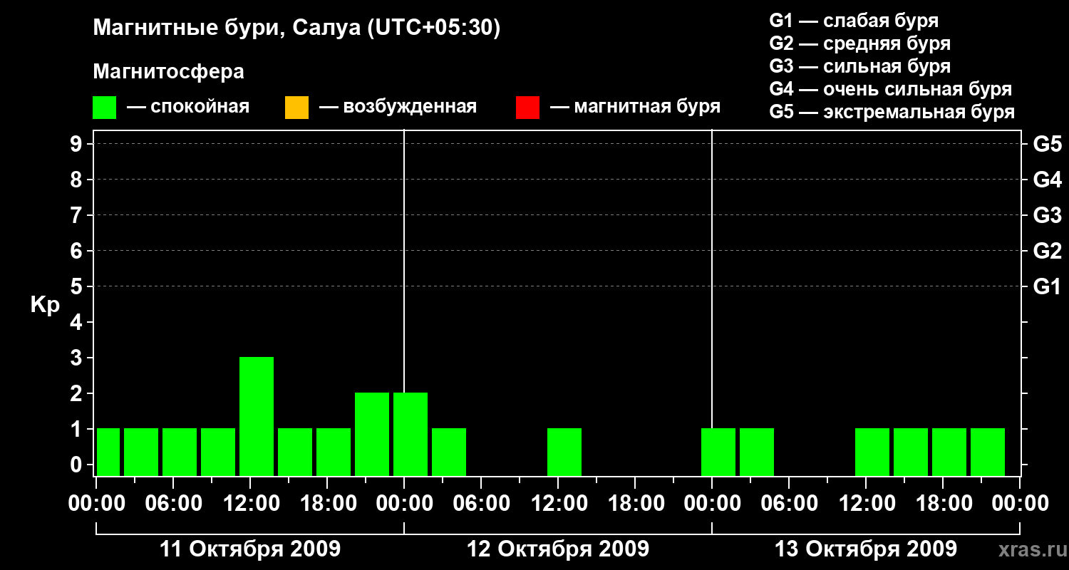 Изменения геомагнитного индекса Kp с 11 по 13 октября 2009 года для средних широт