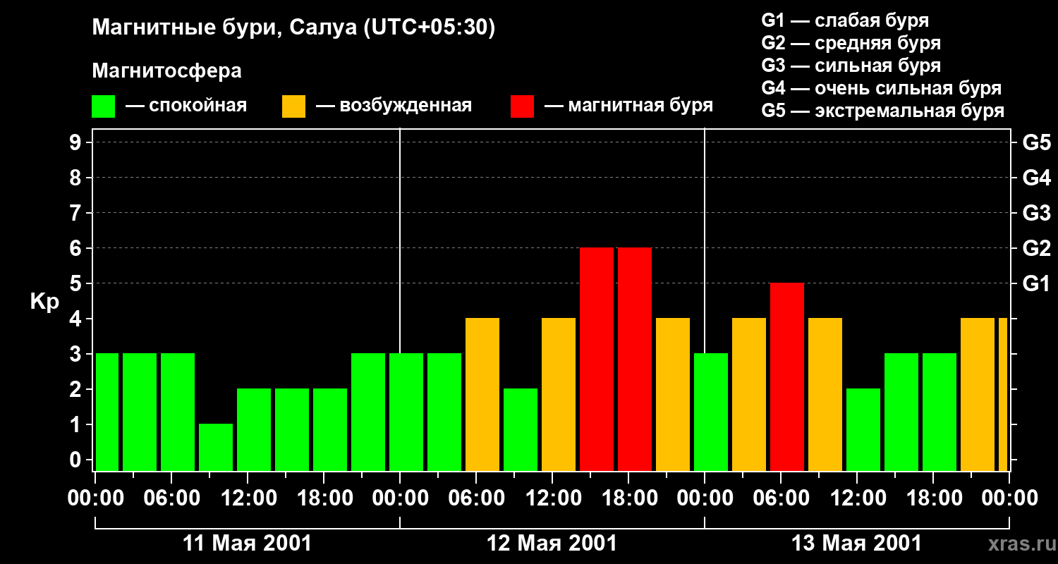 Изменения геомагнитного индекса Kp с 11 по 13 мая 2001 года для средних широт