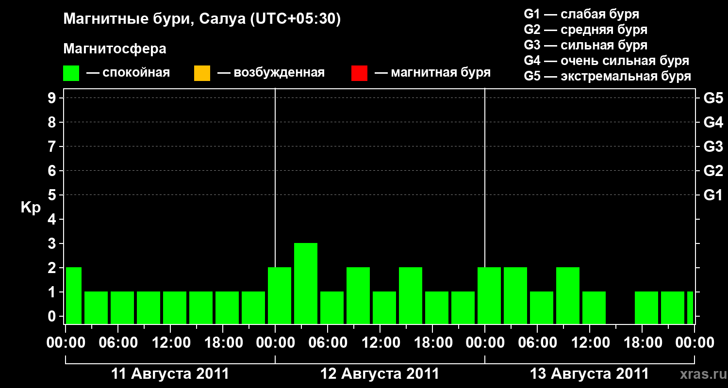 Изменения геомагнитного индекса Kp с 11 по 13 августа 2011 года для средних широт