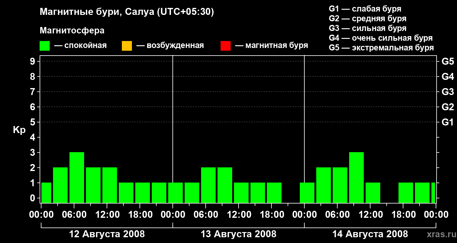 Изменения геомагнитного индекса Kp с 12 по 14 августа 2008 года для средних широт
