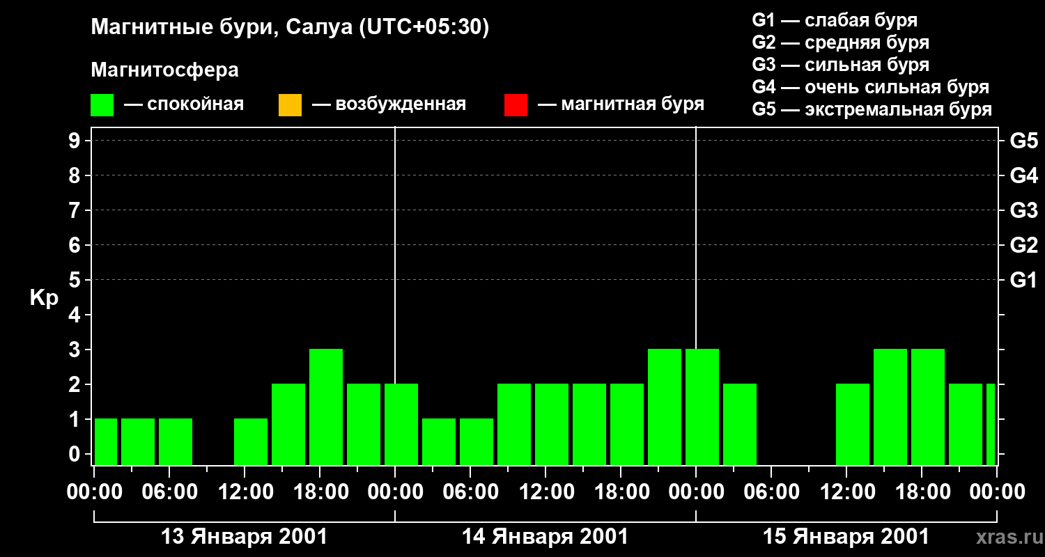 Изменения геомагнитного индекса Kp с 13 по 15 января 2001 года для средних широт
