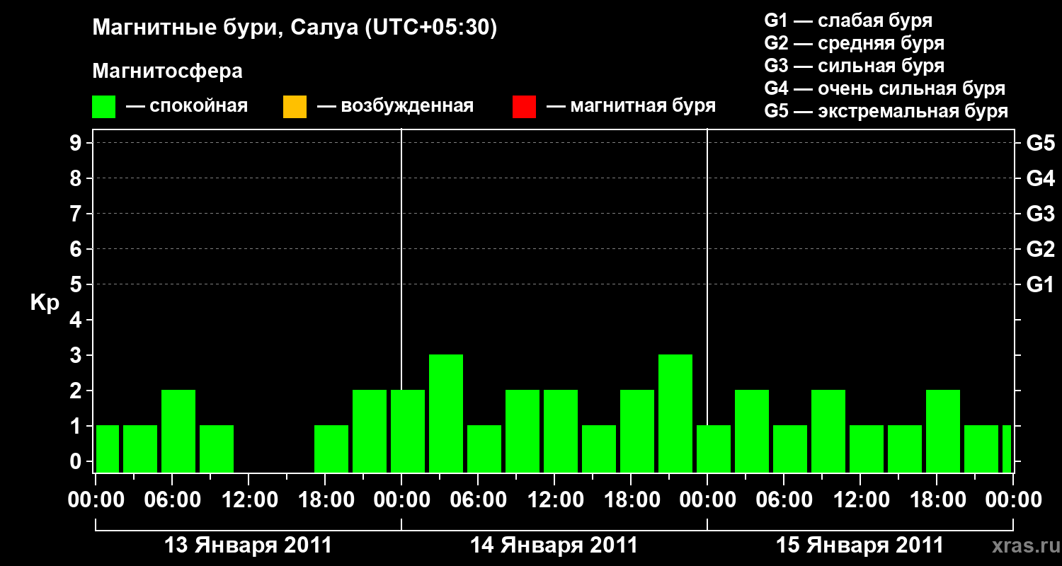 Изменения геомагнитного индекса Kp с 13 по 15 января 2011 года для средних широт