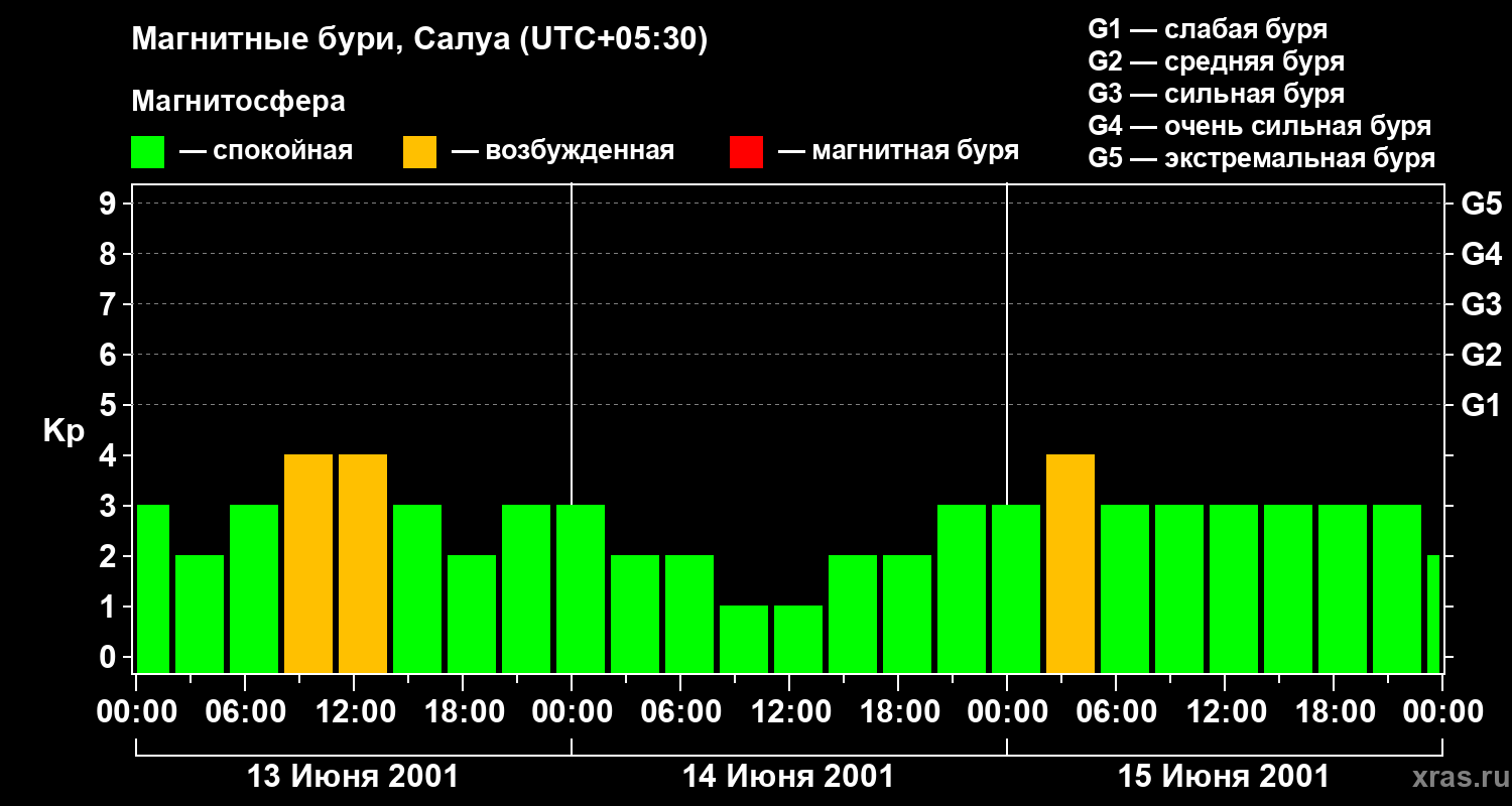 Изменения геомагнитного индекса Kp с 13 по 15 июня 2001 года для средних широт